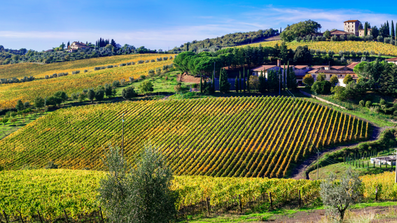 Tuscany is a predominantly hilly region with vineyard elevations rising up to 550 meters above sea level. About a quarter of the landscape is mountainous and a scant 8 percent is officially classified as flat. Approximately 57,942 hectares of the region's nearly 23,000 square kilometers is under vine. The main wine-growing areas of Tuscany include: Chianti, Montalcino, Montepulciano, The Tuscan coast Sangiovese grapes thrive in the interior hillside vineyards in the Chianti zone that runs between Florence and Siena, as well as in the Montalcino and Montepulciano areas, where its best expressions evolve. Cabernet Sauvignon flourishes in the warmer areas along the Tuscan coast. Soils in Tuscany range from soft and crumbly, marl-like clay-limestone and dense sandstone in the Apennine foothills to sandy clay around San Gimignano and gravelly clay and sandy soils in the Bolgheri and Maremma areas. Tuscany's climate is Mediterranean with dry, hot summers; warm springs; and mild, rainy autumns and winters. Variations in altitude, exposition, and diurnal temperatures in the foothills contribute to climatic conditions that help balance the sugar, acidity, and aromatics in the grapes primarily Sangiovese planted there. Coastal areas like Bolgheri and Val di Cornia tend to be more temperate. source: SevenFifty Daily